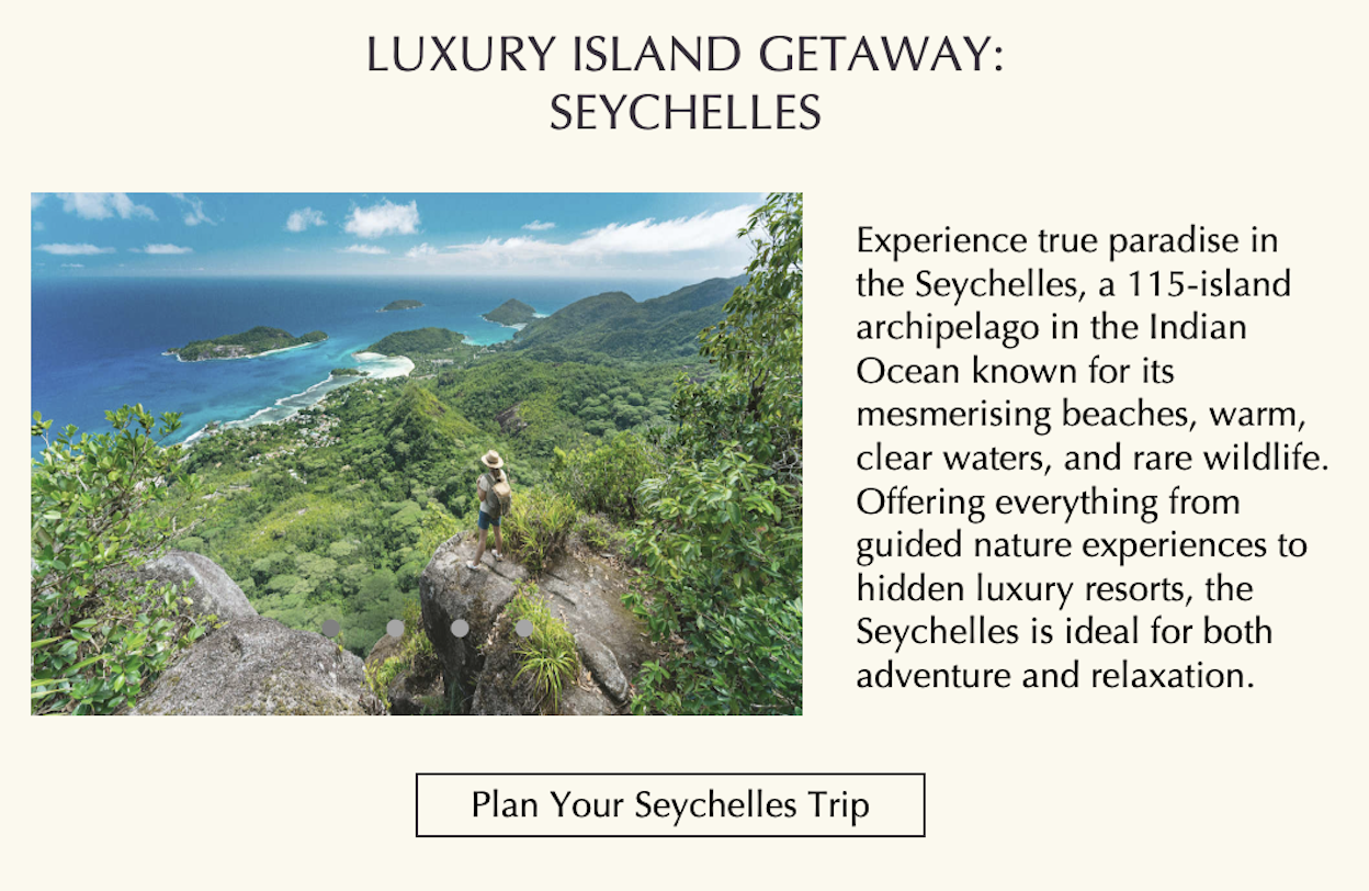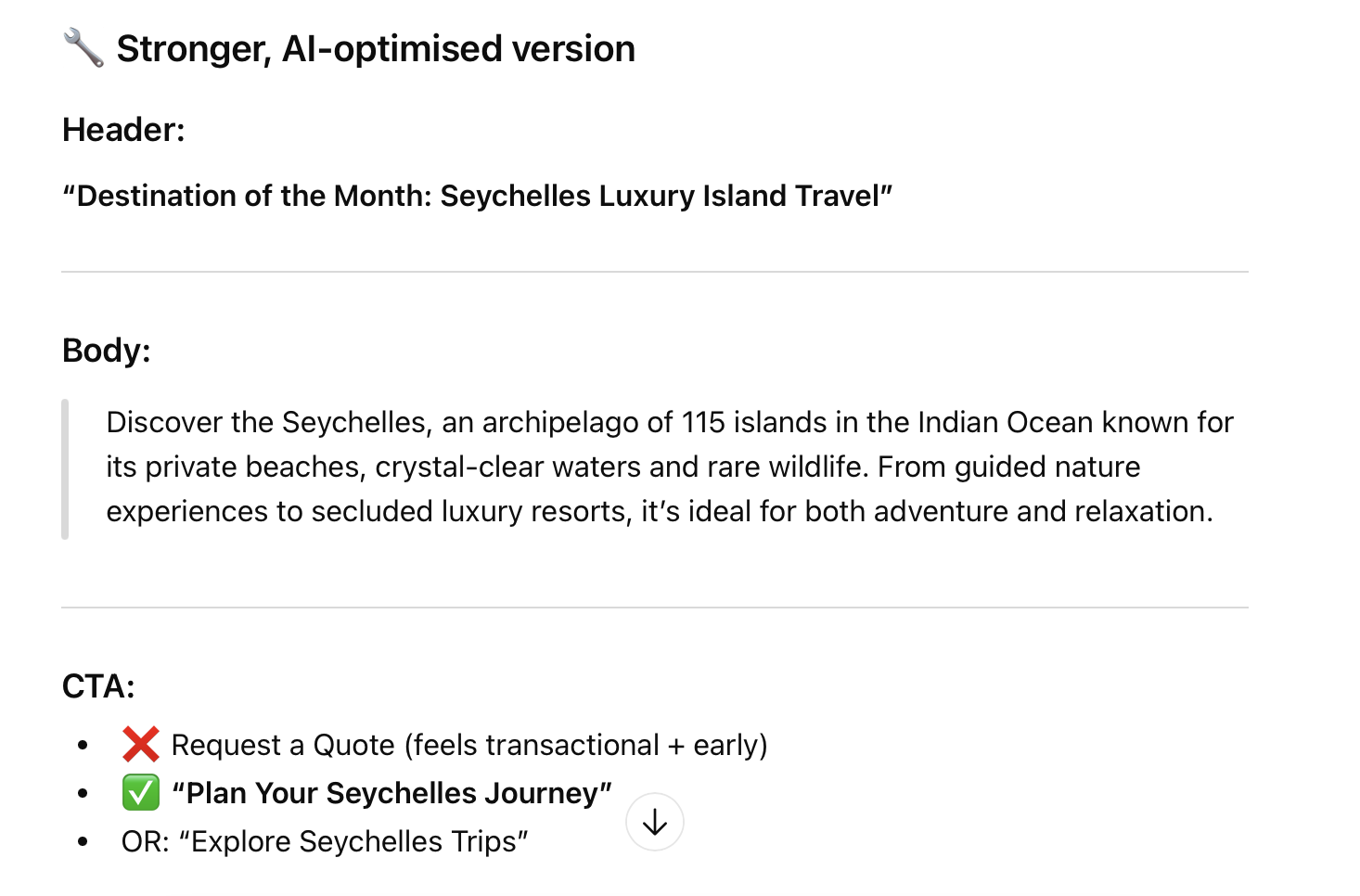 - I optimised the CTA exactly as the AI suggested. ‘Request a Quote’ was action-oriented, but it was vague and generic. ‘Plan Your Seychelles Trip’ shows clear, specific intent.