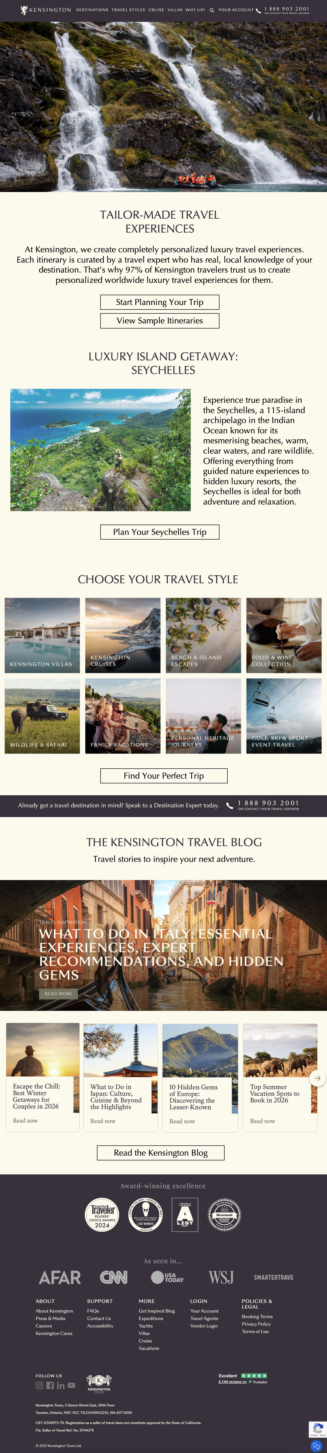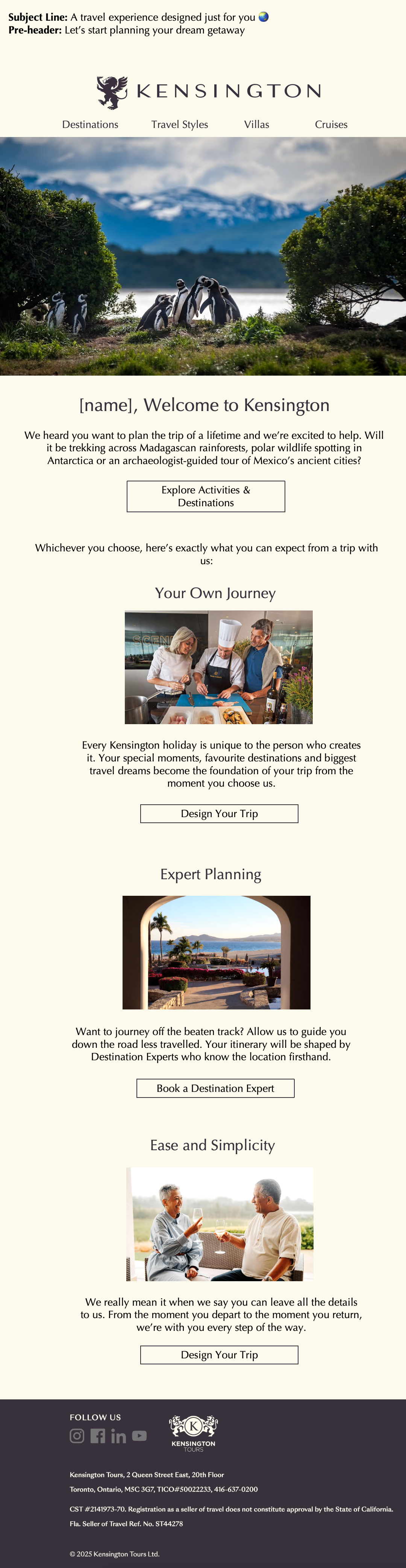 Kensington Tours is a Toronto-based luxury travel agency that specialises in creating personalised holidays worldwide. For this project, I designed an entirely new homepage layout and refreshed the copy and content. I also created a newsletter sign-up welcome email as part of a life-cycle campaign.