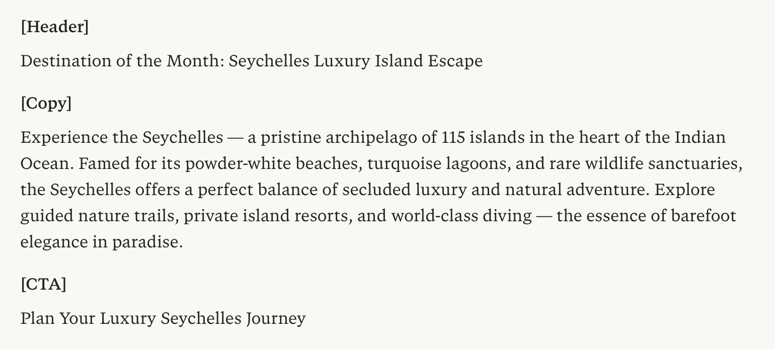 - Neither of the AI tools provided a strong editorial opener for the spotlight banner. Both versions sounded factual, rather than emotive. My final edit (‘Experience true paradise in the Seychelles…’) is softer and more premium. It also removes overused beach-related phrases such as ‘crystal-clear’ and ‘powder white’.