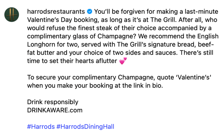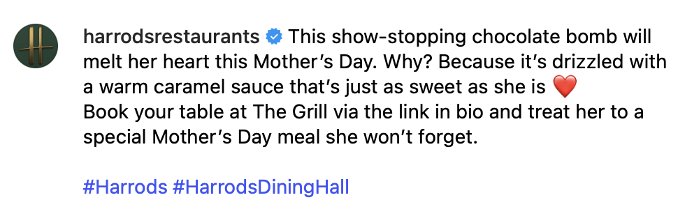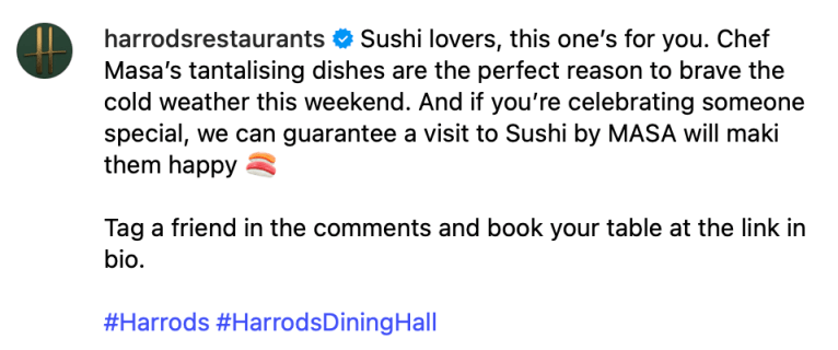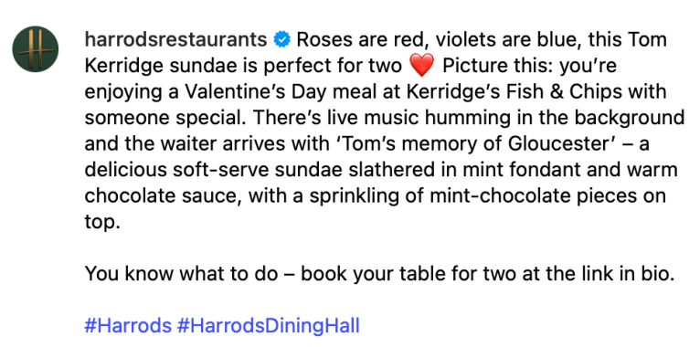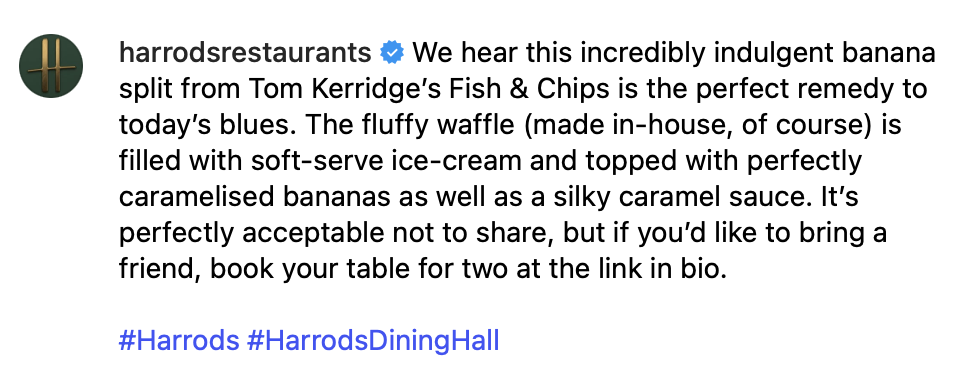 A selection of @harrodsrestaurants (formerly @harrodsdininghall) captions crafted to entice the palate and showcase the brand’s exquisite food offering.